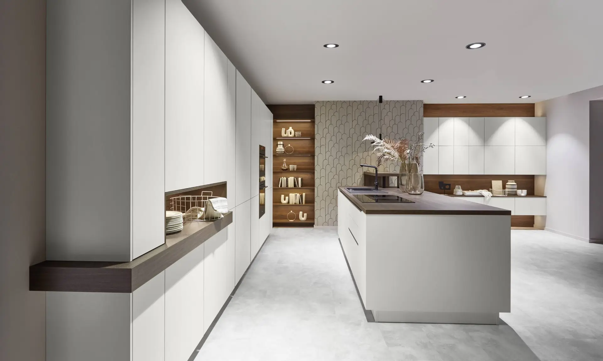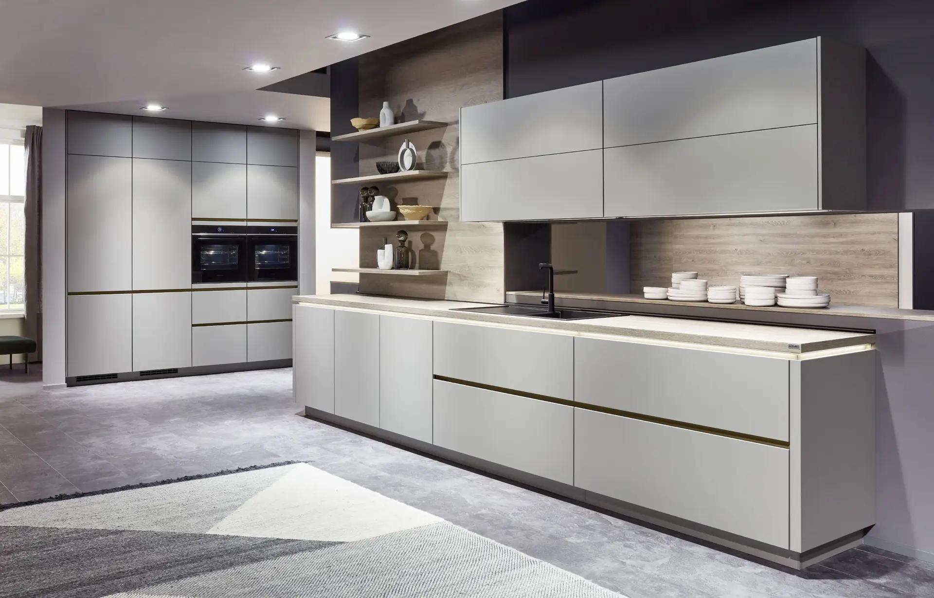 Besonders im Trend liegt der Verzicht auf Griffe. Aussparungen, Druckmechanismen oder gefräste Kanten ersetzen diese und sorgen für glatte Oberflächen ohne vorstehende Elemente. Die Küche wirkt so wie aus einem Guss, einheitlich, ebenmäßig, ruhig und stylisch. Besondere Oberflächenveredelungen stellen sicher, dass auch auf hochglänzenden Fronten Fingerabdrücke unsichtbar sind.
